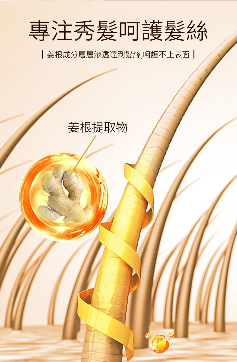 現代活性萃取與乳化科技:有效提取姜根中的活性成分,並通過精良的乳化工藝將滋養油脂均勻融合,確保成分穩定、質地輕盈,實現深層滲透滋養且無油膩殘留。
