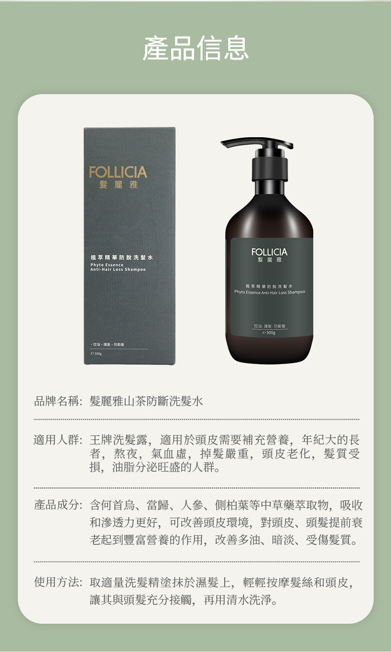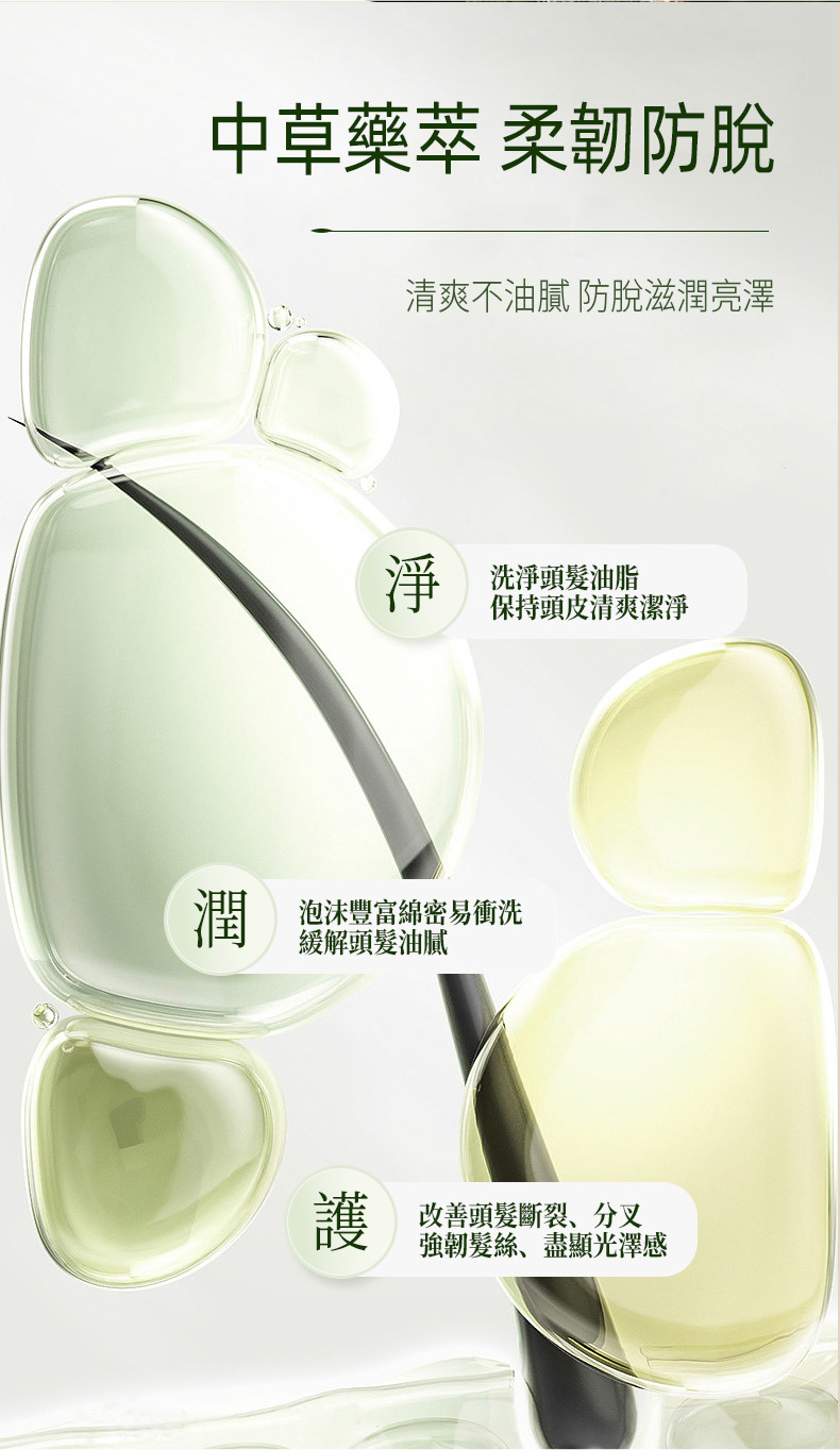 | 產品定位 | 一款專為解決頭髮脫落、髮質脆弱問題而設計的高端植萃養髮型洗髮水。它融合傳統草本智慧與現代頭皮護理科技,旨在通過日常清潔實現深層養護,強健髮根與髮絲。 |