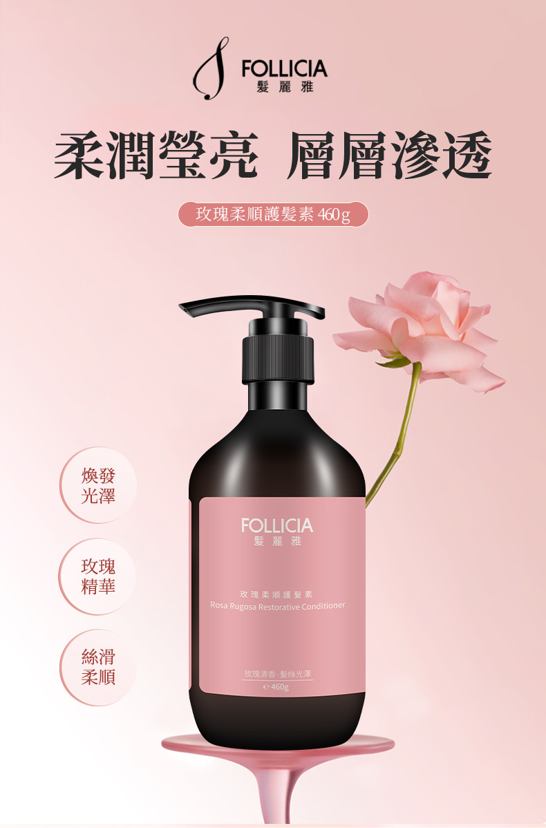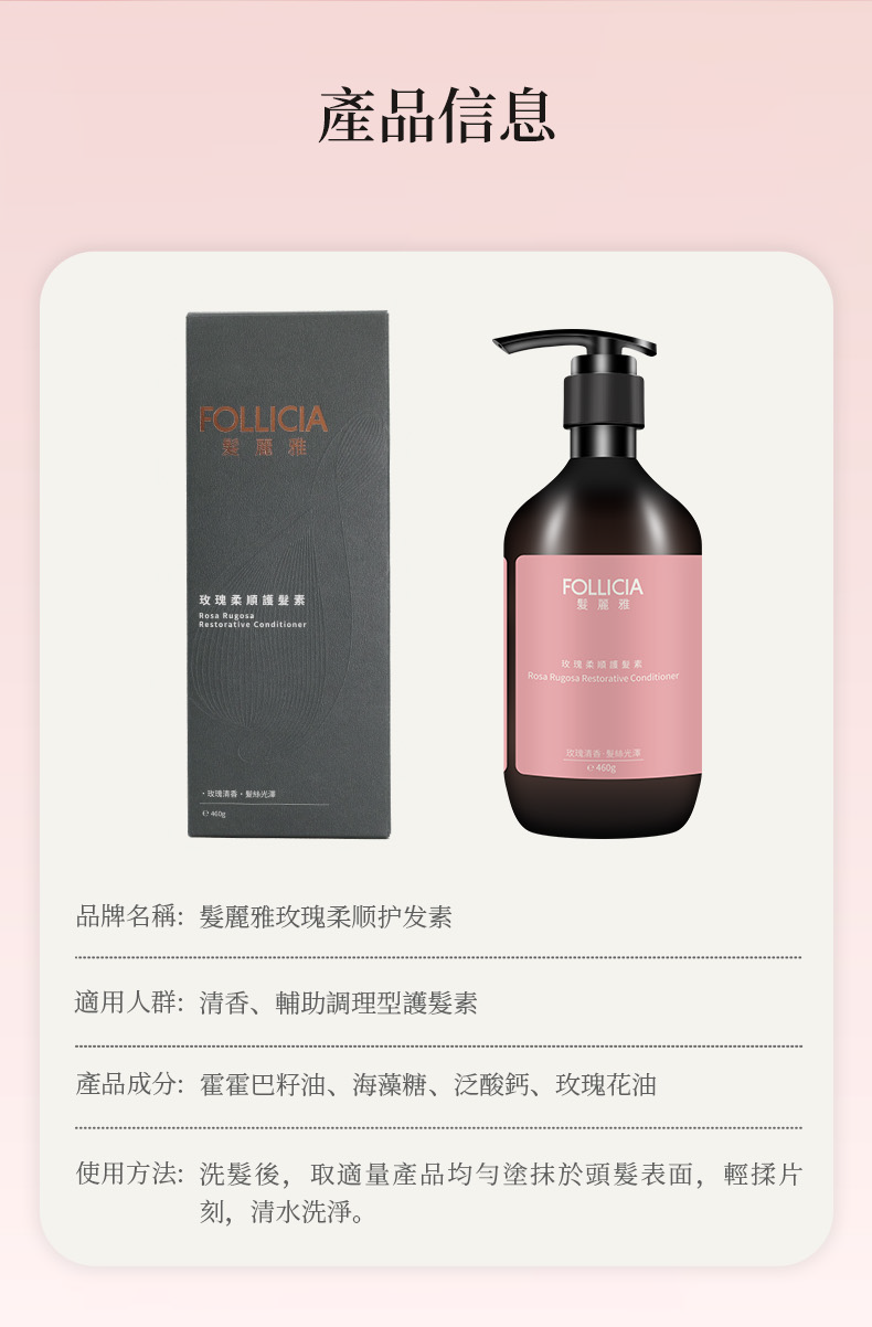 | 主要功效 | 深層修護滋養:針對受損髮質進行內在修護,補充流失的營養與水分。瞬間順滑柔亮:有效撫平毛躁,增強髮絲光澤,使秀髮柔軟、絲滑、飄逸且易梳理。長效保濕防燥:鎖住髮絲水分,防止乾枯,維持長效柔潤狀態。香氛舒緩體驗:持久的淡雅玫瑰香氣,帶來身心放鬆的愉悅護理時光。 |