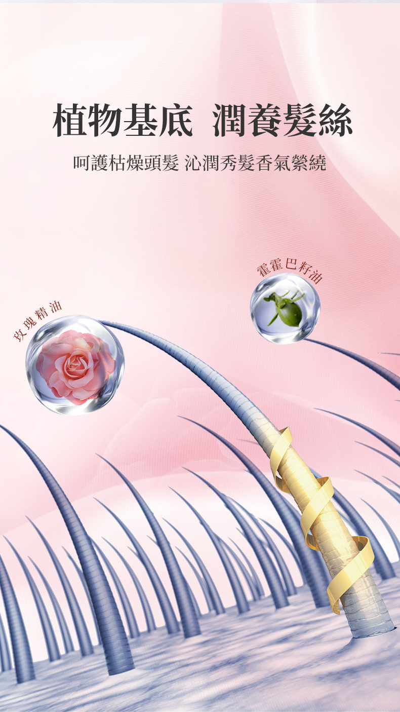 現代精萃與滲透科技:運用萃取技術保留玫瑰等植萃成分的活性,並透過配方科技使產品呈現輕盈質地,確保營養能快速被髮絲吸收,無油膩殘留感。 |